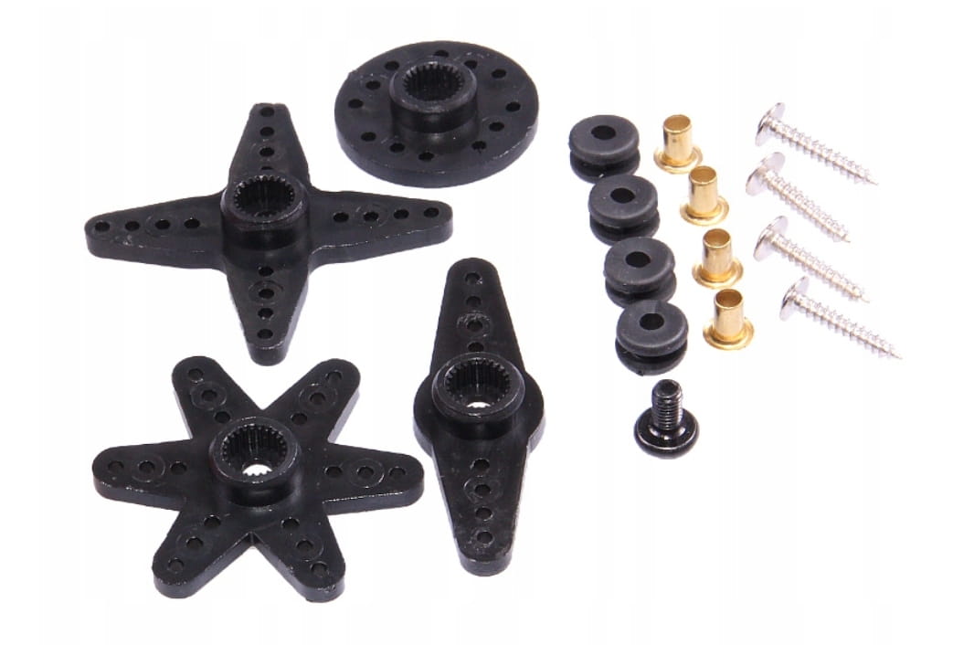 Serwo 6620MG jest dostarczane z kompletnym zestawem montażowym, który zawiera wszystkie niezbędne elementy do jego łatwej i szybkiej instalacji. Zestaw zawiera: